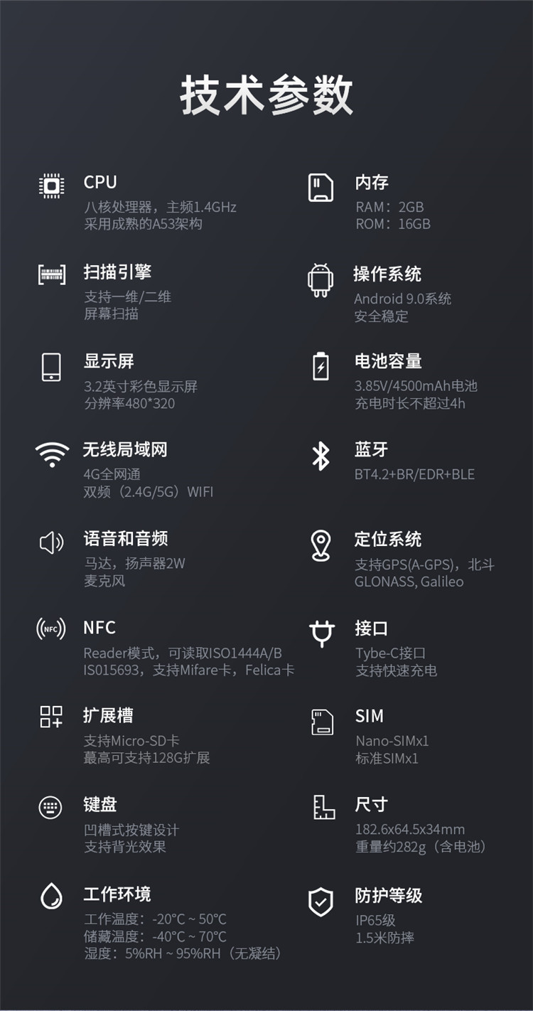 防护等级:IP55 1.5米防跌落,防尘、防水